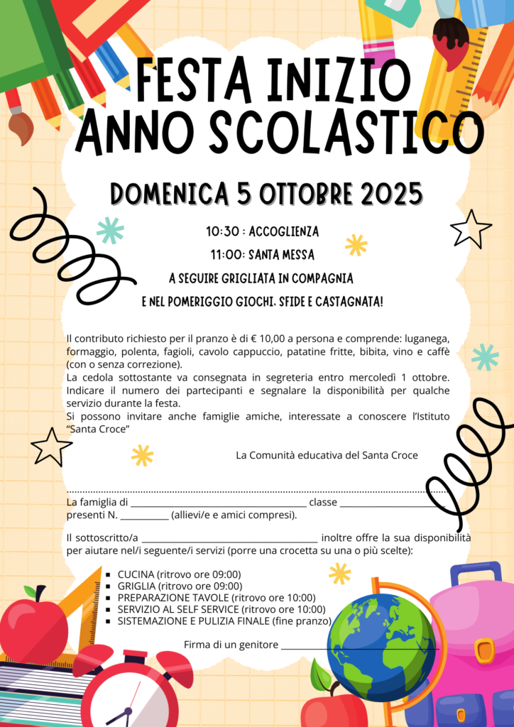 Con l’inizio dell’anno scolastico ci sarà un momento di festa per bambini, genitori ed insegnanti. Per l’occasione, oltre ad una buonissima grigliata, verranno preparate delle ottime castagne, tutto accompagnato da giochi in compagnia.